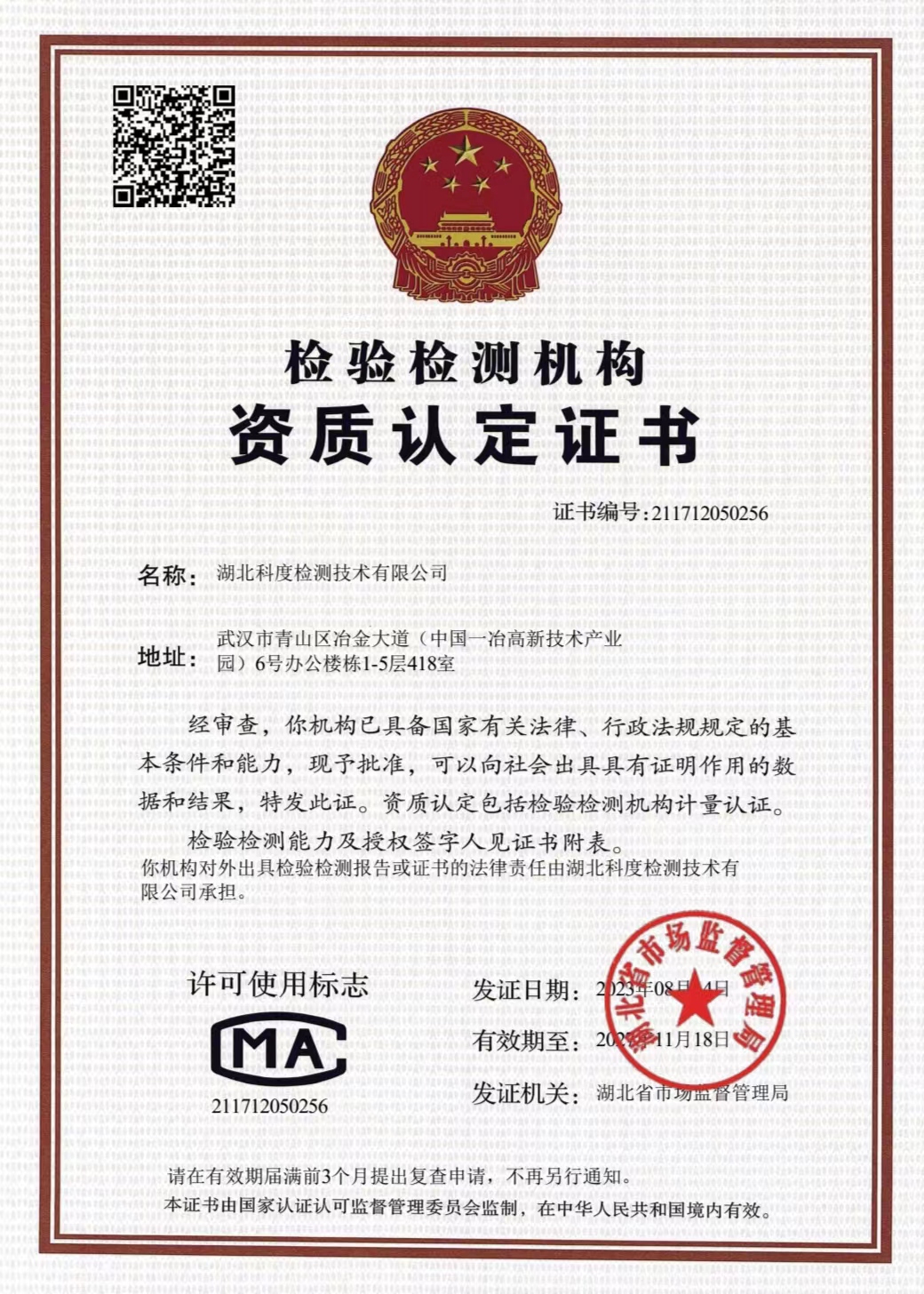 湖北科度檢測技術(shù)有限公司是一家專業(yè)從事環(huán)境類及相關(guān)領(lǐng)域檢測的第三方檢測機構(gòu),公司已通過湖北省市場監(jiān)督管理局CMA計量認證,可以面向社會出具權(quán)威CMA檢測報告。 我公司實驗室嚴格按照國家標(biāo)準(zhǔn)建設(shè),擁有一大批國內(nèi)外先進儀器設(shè)備及現(xiàn)代化配套設(shè)施,并有經(jīng)驗豐富的中高級專業(yè)技術(shù)人員和嚴格的實驗室質(zhì)量保證體系為項目運作提供強力支撐。 作為第三方檢測機構(gòu),公司始終以高度的社會責(zé)任感經(jīng)營企業(yè),以“公正、嚴謹、高效”為宗旨,依托專業(yè)的技術(shù)實力為客戶提供專業(yè)優(yōu)質(zhì)檢測服務(wù),受到政府、企業(yè)和社會各界的廣泛關(guān)注和認可。